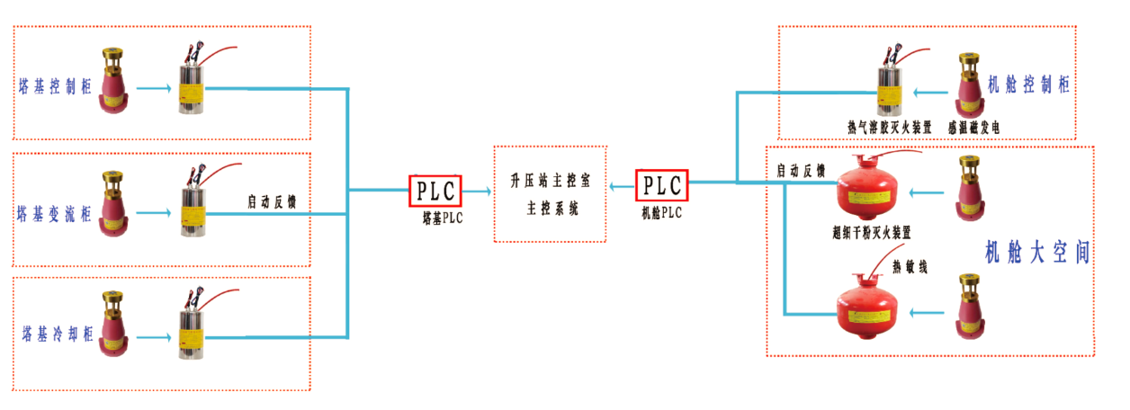 機(jī)艙柜內(nèi)的滅火裝置啟動(dòng)后輸出無(wú)源開關(guān)量信號(hào)接入機(jī)艙內(nèi)風(fēng)機(jī)主控系統(tǒng)預(yù)留的報(bào)警端口,通過(guò)主控系統(tǒng)傳輸?shù)缴龎赫局骺厥?塔基柜內(nèi)的滅火裝置啟動(dòng)后輸出無(wú)源開關(guān)量信號(hào)接入塔基內(nèi)風(fēng)機(jī)主控系統(tǒng)預(yù)留的報(bào)警端口,通過(guò)主控系統(tǒng)傳輸?shù)缴龎赫局骺厥?