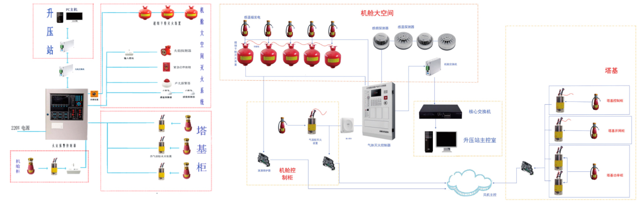 由主控系統(tǒng)反饋:機艙柜內(nèi)的滅火裝置啟動后輸出無源開關(guān)量信號接入機艙內(nèi)風機主控系統(tǒng)預(yù)留的報警端口,通過主控系統(tǒng)傳輸?shù)缴龎赫局骺厥遥駜?nèi)的滅火裝置啟動后輸出無源開關(guān)量信號接入塔基內(nèi)風機主控系統(tǒng)預(yù)留的報警端口,通過主控系統(tǒng)傳輸?shù)缴龎赫局骺厥遥?/p>